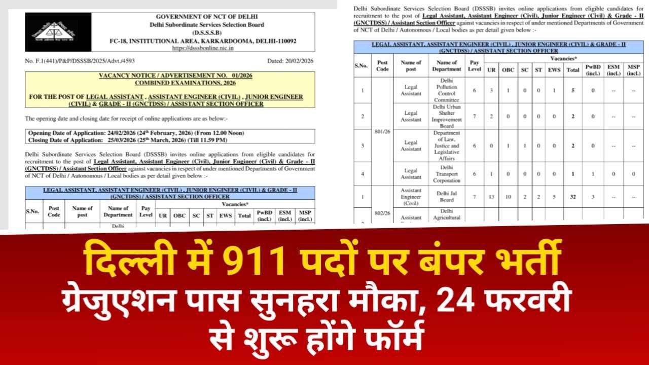 DSSSB Vacancy 2026: दिल्ली में सरकारी नौकरी (Government Job) की तैयारी कर रहे युवाओं के लिए बड़ी खुशखबरी है। Delhi Subordinate Services Selection Board (DSSSB) ने साल 2026 की नई भर्ती का नोटिफिकेशन जारी कर दिया है। इस बार लीगल असिस्टेंट, असिस्टेंट इंजीनियर (Civil), जूनियर इंजीनियर (Civil) और असिस्टेंट सेक्शन ऑफिसर (ASO) समेत कुल 911 पदों पर भर्ती निकाली गई है। इच्छुक अभ्यर्थी आधिकारिक वेबसाइट dsssb.delhi.gov.in पर जाकर ऑनलाइन आवेदन (Online Application) कर सकते हैं।