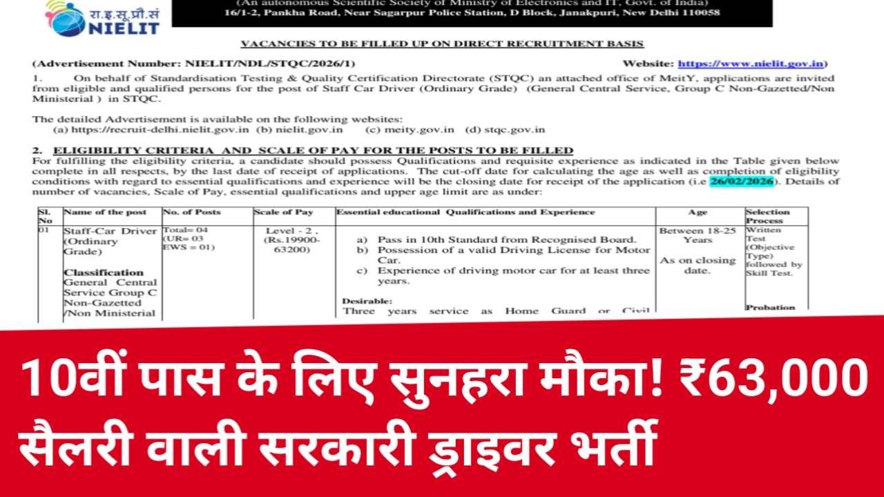 NIELIT Driver Apply Online 2026: अगर आप 10वीं पास हैं और ड्राइविंग जानते हैं, तो सरकारी नौकरी पाने का यह शानदार अवसर हाथ से न जाने दें। National Institute of Electronics and Information Technology (NIELIT) ने स्टाफ कार ड्राइवर (Staff Car Driver) पदों पर भर्ती निकाली है। आवेदन प्रक्रिया पहले से जारी है और 26 फरवरी 2026 अंतिम तिथि तय की गई है। ऐसे में इच्छुक उम्मीदवारों को तुरंत ऑनलाइन आवेदन (Apply Online) कर लेना चाहिए।