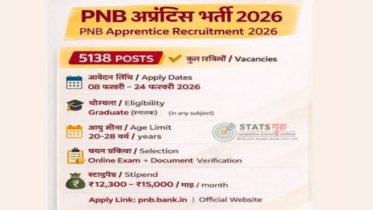 PNB Bank Apprentice Recruitment 2026: बैंकिंग सेक्टर में करियर बनाने की तैयारी कर रहे ग्रेजुएट युवाओं के लिए बड़ी खबर है। पंजाब नेशनल बैंक ने अप्रेंटिस (Apprentice Recruitment 2026) के तहत 5,138 पदों पर आवेदन आमंत्रित किए हैं। यह स्थायी नौकरी नहीं बल्कि 12 महीने का ट्रेनिंग प्रोग्राम है, जिसमें उम्मीदवारों को बैंक का रियल-टाइम अनुभव (practical banking exposure) मिलेगा और भविष्य की बैंक परीक्षाओं के लिए मजबूत तैयारी भी हो जाएगी।