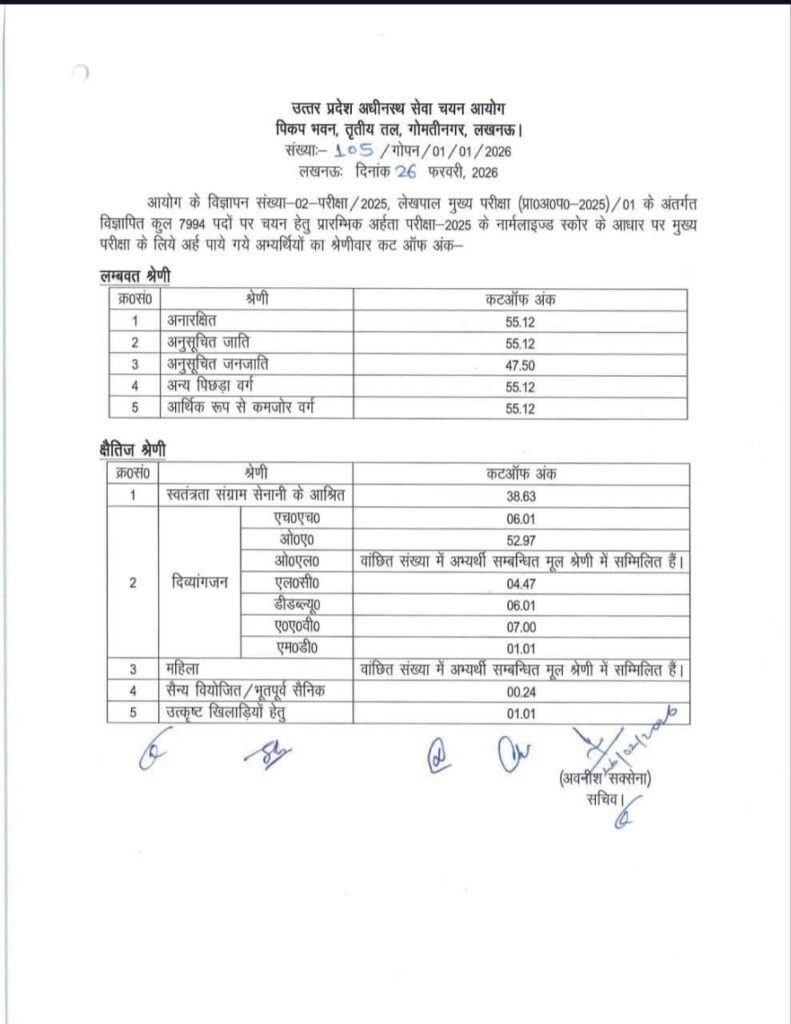 UPSSSC UP Lekhpal Cut Off 2025: उत्तर प्रदेश में लेखपाल भर्ती की तैयारी कर रहे युवाओं के लिए बड़ी अपडेट सामने आई है। उत्तर प्रदेश अधीनस्थ सेवा चयन आयोग (UPSSSC) ने लेखपाल मुख्य परीक्षा 2025 के लिए श्रेणीवार कटऑफ (Category-wise Cut Off) जारी कर दी है। आयोग द्वारा 26 फरवरी 2026 को जारी सूचना के अनुसार, PET 2025 के नॉर्मलाइज्ड स्कोर के आधार पर मुख्य परीक्षा के लिए अभ्यर्थियों को अर्ह घोषित किया गया है।