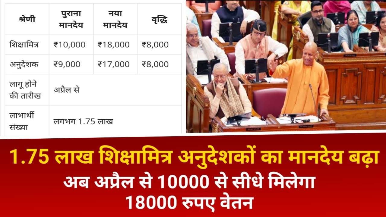 UP Shikshamitra Mitra salary Hike: उत्तर प्रदेश में लंबे समय से वेतन वृद्धि की मांग कर रहे शिक्षामित्रों के लिए बड़ी खबर सामने आई है। योगी आदित्यनाथ की सरकार ने बड़ा फैसला लेते हुए शिक्षामित्रों का मासिक मानदेय 10,000 रुपये से बढ़ाकर 18,000 रुपये कर दिया है। यह बढ़ा हुआ भुगतान अप्रैल महीने से लागू होगा। इसी के साथ अनुदेशकों का मानदेय भी बढ़ाकर 17,000 रुपये कर दिया गया है।